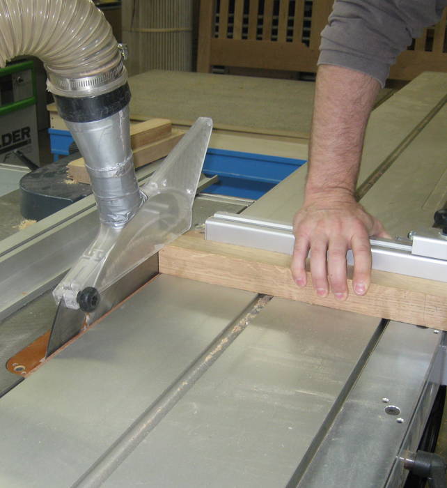 In my technique, step one is setting up the shaper to cut the locking miter joints. I’ll discuss this in-depth in a future Tip post. Once this is complete I set up my power feeder and hold-down to process all the horizontal cuts first.