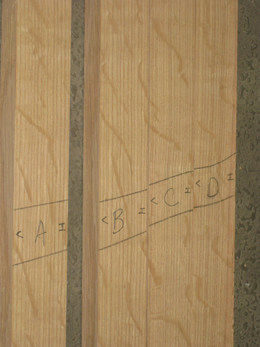 MILL STOCK I start by selecting wood for my legs. In addition to wanting to show the ray fleck pattern on all four sides of the leg, I like to mill each leg’s pieces from the same board, so the grain pattern appears to flow around the leg. So step one for me is to select boards that will yield four sides of a leg, and mark them so I’ll be able to reassemble them in the correct order once the joints have been cut.