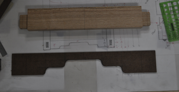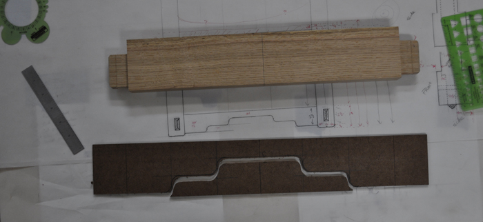 Laying out the templates shape is done by either transferring the design from a drawing, or actually creating the shape on the template itself. If transferring the shape from a full-size drawing you’ve already had a dry run at drawing the template shape; and you can use the same drawing tools to recreate the shape on the template material.