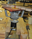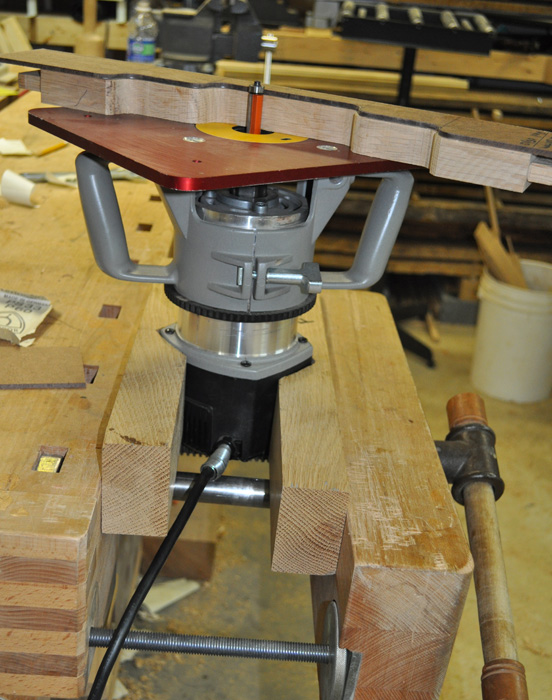 Notice, the unconventional router table I use. It’s simply a 3 horsepower router held in my bench vise, with the help of a couple contouring blocks of wood. It has a larger, thicker, robust bottom plate that becomes the router table surface, for me it is more than adequate to register and control most cuts. This arrangement allows me to quickly set up and execute flush trim cutting operations.