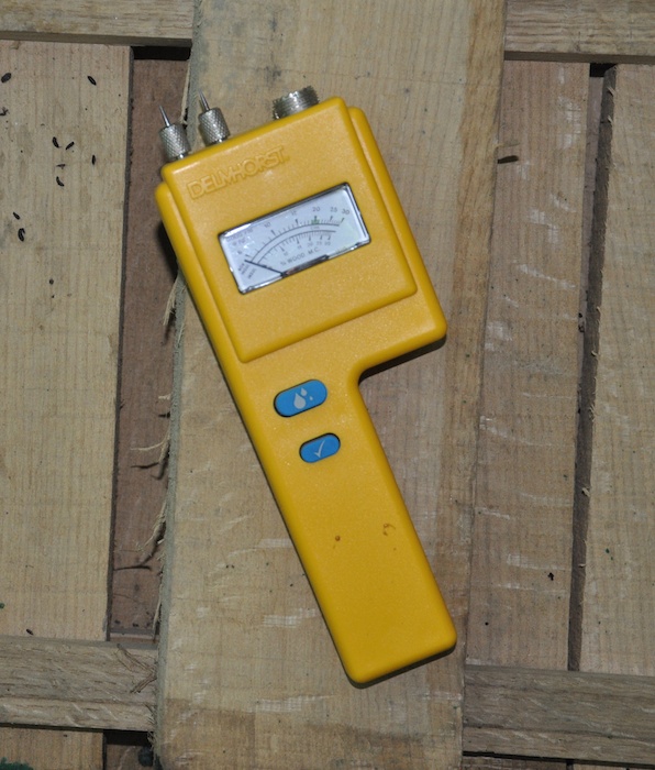 It’s been about 14 months since I stacked and began drying my lumber. So following the rule-of-thumb that it takes 1 year per inch of thickness for a board to reach equilibrium with the surrounding environment, I decided to uncover my pile and check the moisture content of the 4/4 lumber. I’m in Northern Virginia so the typical moisture content for my area should be in the vicinity of 11- 13%. To really understand how the drying process is going it’s necessary to measure the moisture on the surface of the board, as well as the interior, or core, of the board. To do this I use a Delmhorst J-4 for the surface checks and attach a Remote Electrode to drive pins into the core for interior checks.