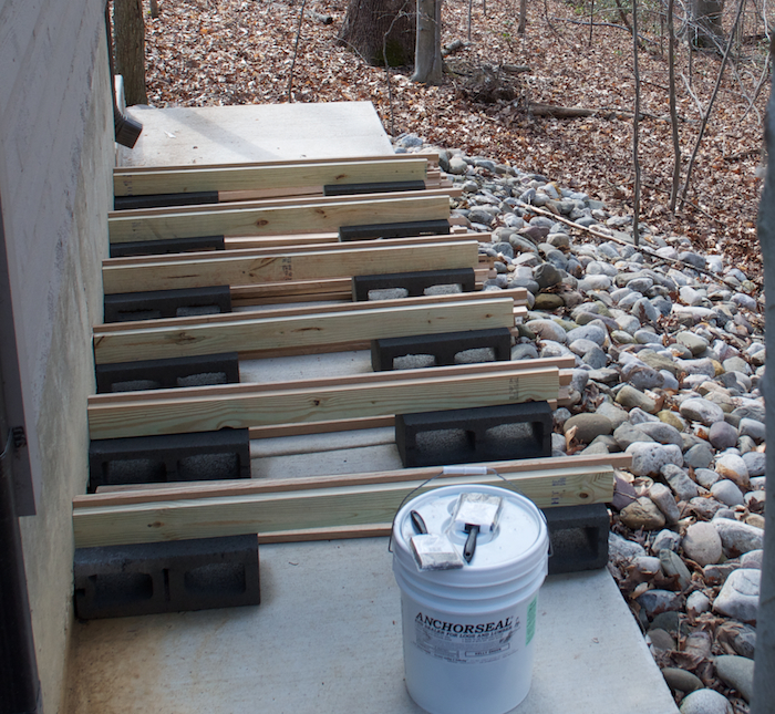 I use a layer of cinder blocks with 2 X 4 beams going across them for my foundation. Place these 16″ – 24″ apart. The normal rule of thumb is 16″ for softwood and 24″ for hardwood. The 2 x 4s are two lengths screwed together to essentially form a 4 x 4. I cut a dado down the center of the 4 x 4 to hold a sticker halfway proud of the beam.