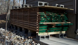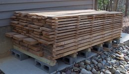 Now your ready to build your stack. Putting wider boards on the bottom serves the dual purposes of helping keep them flat and making a more stable stack. To help facilitate air movement through the stack, establish gaps of at least 3/4″ between board edges in the layers, and stagger the gap locations from layer to layer to increase the stack’s stability.